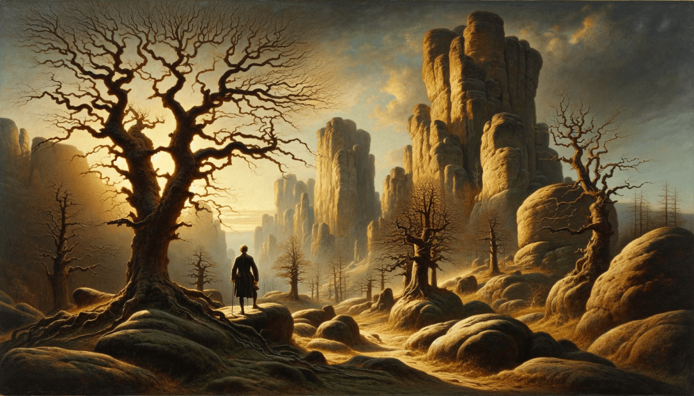 Ein handgemalte Kunstwerk auf Leinwand im Stil von Caspar David Friedrich. Das Gemälde strahlt eine besinnliche und meditative Stimmung aus. Es ladet den Betrachter ein, über die Schönheit der Natur, den Lauf der Zeit und die Beziehung zwischen Mensch und Natur nachzudenken. Das wunderschöne, handgemalte Gemälde zeigt in seine romantische Betonung der Erhabenheit der Natur sowie die spirituellen Verbindung zwischen Mensch und Natur.Das Gemälde ist keine Druck oder Reproduktion, sondern handgemalte Kunstwerk. Wunderschönes, lebendiges Gemälde, das Ihren Räumen Farbe verleiht. Aufwendig vom Künstler für Sie individuell auf hochwertiger Künstlerleinwand gemalt. Dafür benötigt der Künstler ca.6 Wochen!