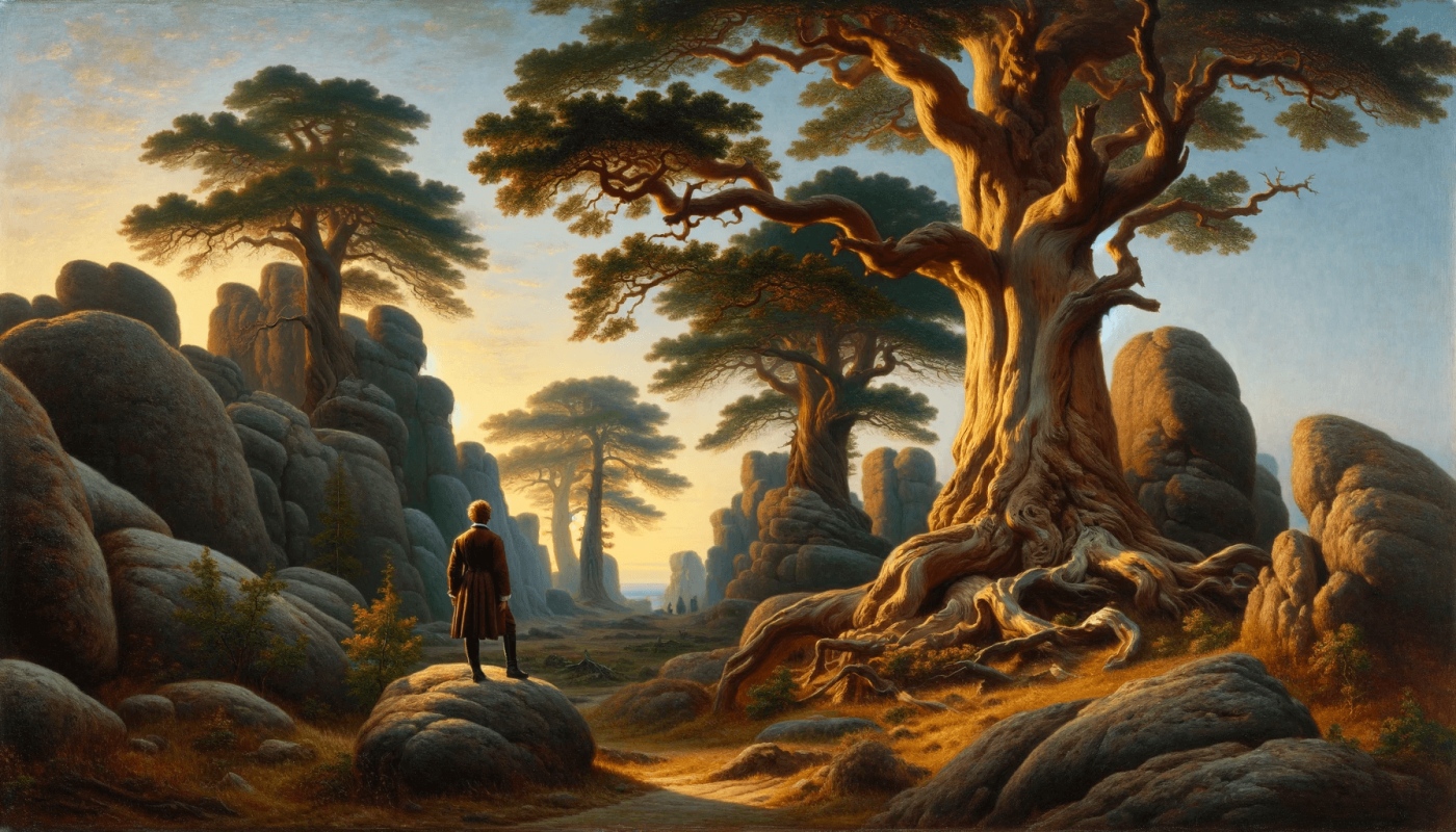 Ein handgemalte Kunstwerk auf Leinwand im Stil von Caspar David Friedrich. Das Gemälde strahlt eine besinnliche und meditative Stimmung aus. Es ladet den Betrachter ein, über die Schönheit der Natur, den Lauf der Zeit und die Beziehung zwischen Mensch und Natur nachzudenken. Das wunderschöne, handgemalte Gemälde zeigt in seine romantische Betonung der Erhabenheit der Natur sowie die spirituellen Verbindung zwischen Mensch und Natur.Das Gemälde ist keine Druck oder Reproduktion, sondern handgemalte Kunstwerk. Wunderschönes, lebendiges Gemälde, das Ihren Räumen Farbe verleiht. Aufwendig vom Künstler für Sie individuell auf hochwertiger Künstlerleinwand gemalt. Dafür benötigt der Künstler ca.6 Wochen!
