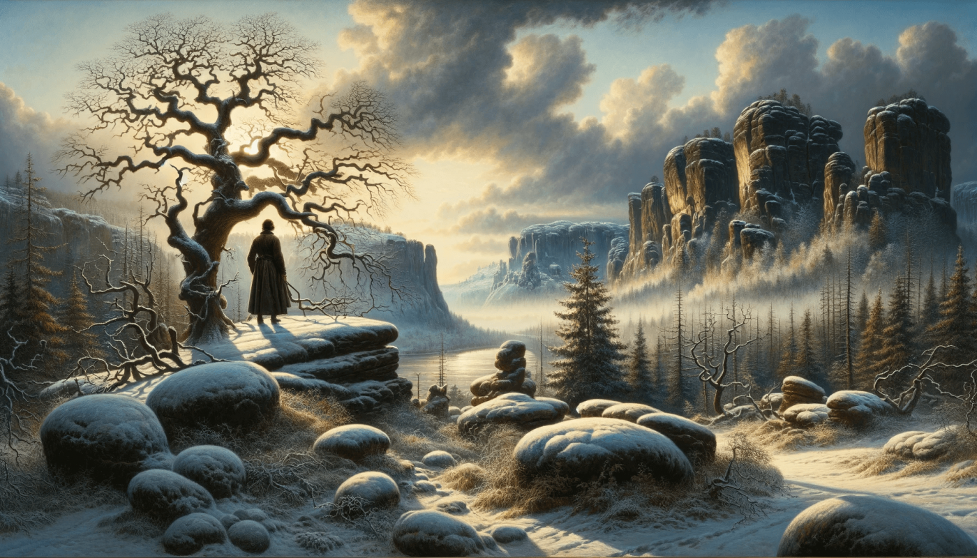 Ein handgemalte Kunstwerk auf Leinwand im Stil von Caspar David Friedrich. Das Gemälde strahlt eine besinnliche und meditative Stimmung aus. Es ladet den Betrachter ein, über die Schönheit der Natur, den Lauf der Zeit und die Beziehung zwischen Mensch und Natur nachzudenken. Das wunderschöne, handgemalte Gemälde zeigt in seine romantische Betonung der Erhabenheit der Natur sowie die spirituellen Verbindung zwischen Mensch und Natur.tDas Gemälde ist keine Druck oder Reproduktion, sondern handgemalte Kunstwerk. Wunderschönes, lebendiges Gemälde, das Ihren Räumen Farbe verleiht. Aufwendig vom Künstler für Sie individuell auf hochwertiger Künstlerleinwand gemalt. Dafür benötigt der Künstler ca.6 Wochen!